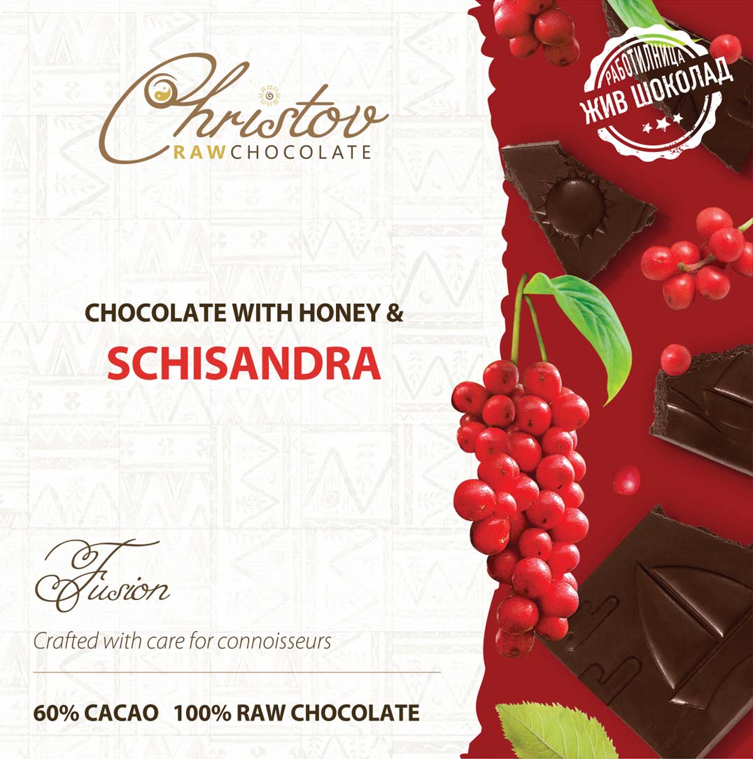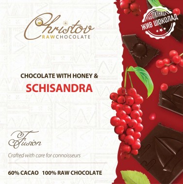 В шоколада с Шизандра много интересно се съчетават горчивия вкус на суровите зърна какао със сладкия билков пчелен мед и взрива от вкусове, които донася Шизандра: кисело, сладко, люто, горчиво и солено.