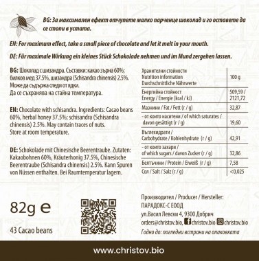 Съставки: 60% какао зърна сорт Криоло*; билков мед*; шизандра (Schisandra chinensis) 2.5%.