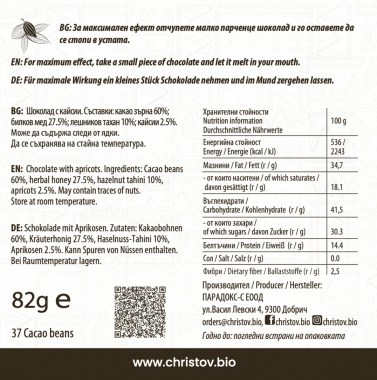 Съставки: 55% какао зърна сорт Криоло*; билков мед*; лешников тахан*; какао масло*; кайсии 2.5%.