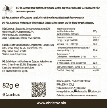 Съставки: 60% какао зърна сорт Криоло*; билков мед*; какао масло*; боровинки 2.5%.