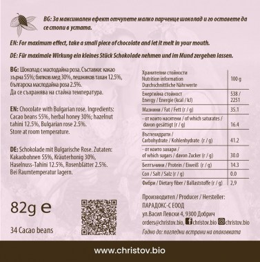 Съставки: 55% какао зърна сорт Криоло*; билков мед*; лешников тахан*; какао масло*; българска маслодайна роза* 2.5%.