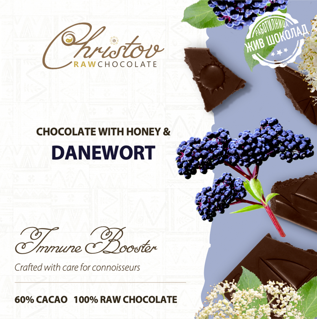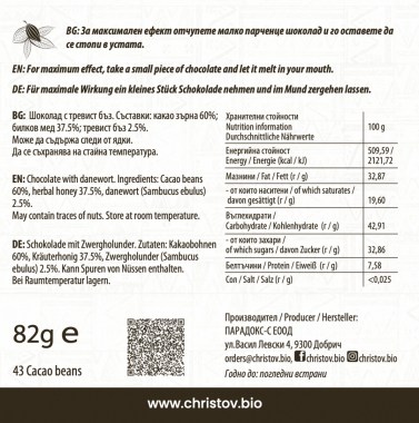Съставки: 60% какао зърна сорт Криоло*; билков мед*; какао масло*; тревист бъз (Sambucus ebulus) 1%.