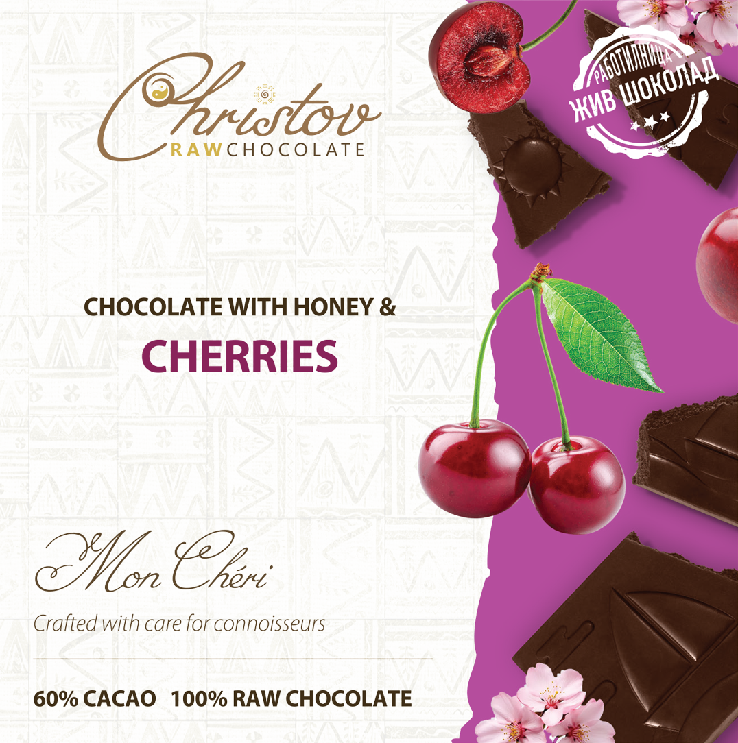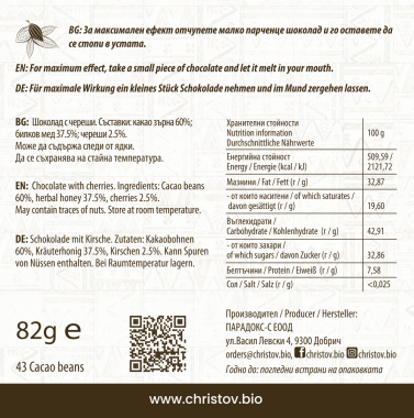 Съставки: 60% какао зърна сорт Криоло*; билков мед*; какао масло*; череши 2.5%.