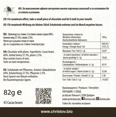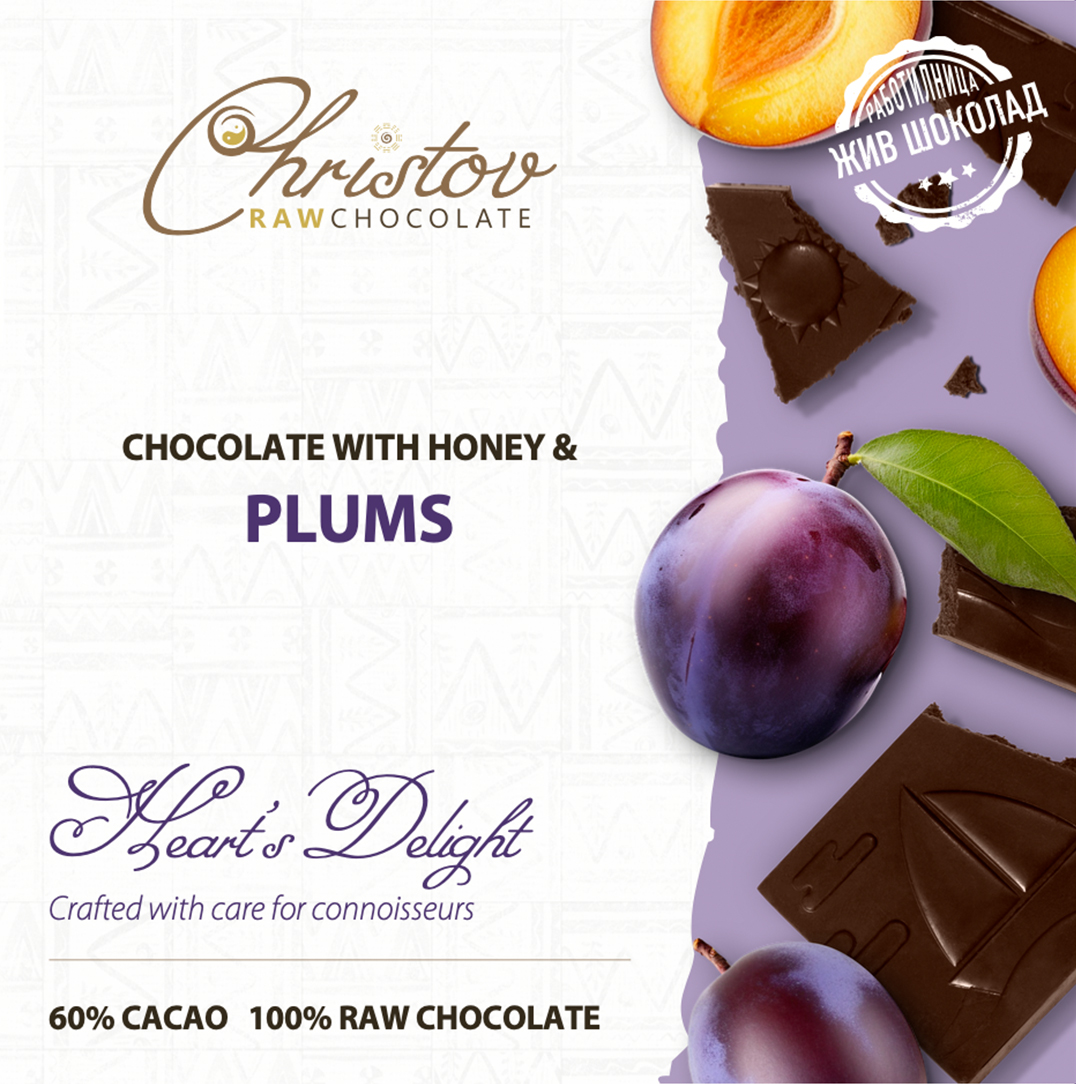 Жив шоколад със сушени сини сливи, съчетан с аромата на суровите зърна какао сорт Криоло и билков пчелен мед от Лудогорието.